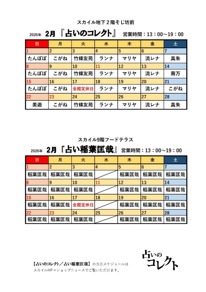 | 定休日 | 不定休 ※その他 スカイル定休日に準ずる 年間3日間 (1月1日/2月、8月の第3火曜日) |