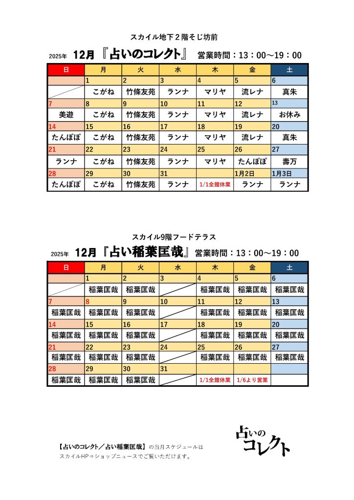 | 定休日 | 不定休 ※その他 スカイル定休日に準ずる 年間3日間 (1月1日/2月、8月の第3火曜日) |